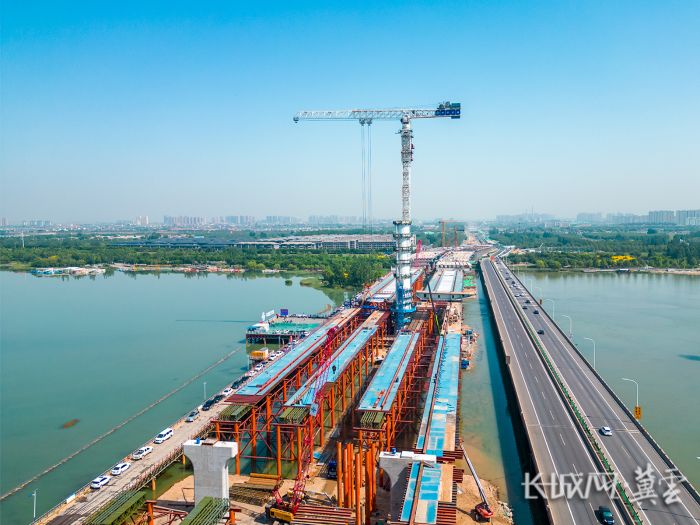 5月15日上午,滹沱河特大桥主桥首片钢箱梁成功吊装。长城网·冀云客户端记者 康义涵 摄