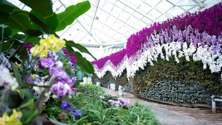百花馆内,园艺师采用石斛兰、空气凤梨、积水凤梨、各种蕨类等50余种植物附生在枯木与沉木之中,与屋顶的炮仗花、垂下的锦屏藤相互交织,让您有一种身处热带雨林的感觉。各种爬藤类植物与竞相绽放的蝴蝶兰交相辉映。步入其中,一股暖意随着眼前绚烂多姿,高低错落的花海温润袭来,让人忍不住放慢脚步,驻足欣赏。