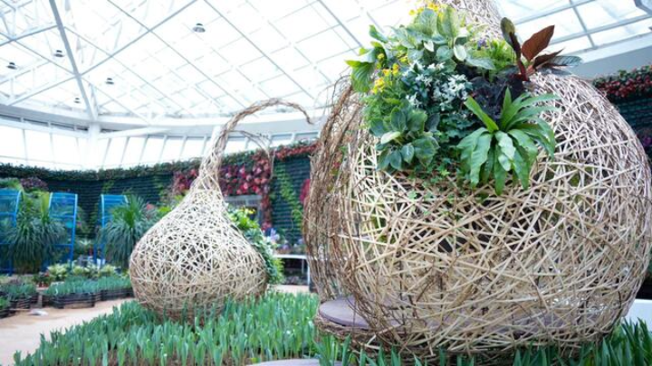 植物园新春花展解锁全新花艺布景,花展温室内新增《向云端》和《生生不息》两个大型微景观花艺作品。其中作品《向云端》以蔚蓝的天空为背景,以云中花为载体,巧妙地将天空与花朵融为一体,寓意着人们心中那些看似遥不可及的美好愿望,仿佛一朵朵娇艳的花朵在云端绽放,令人憧憬。《生生不息》则以种子的造型为基础,采用钢结构作为主体框架,表面为纯手工植物材料编织。作品中融入互动元素,让观众可以亲身参与其中,为观众提供了一个感悟自然的平台。