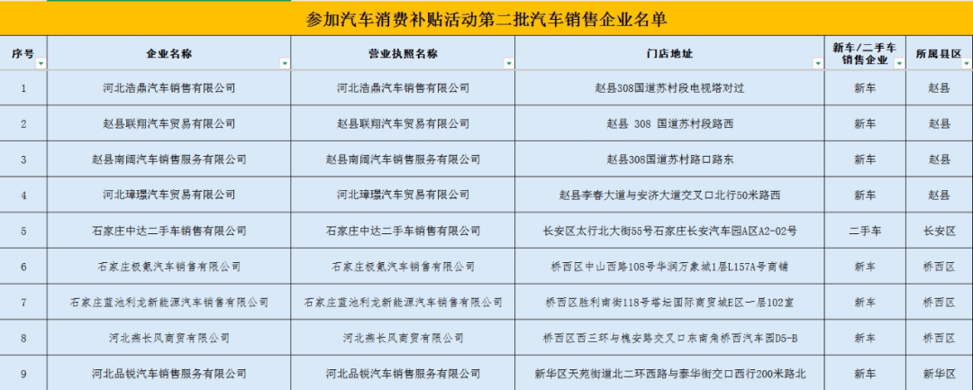 参加汽车消费补贴活动第二批汽车销售企业名单