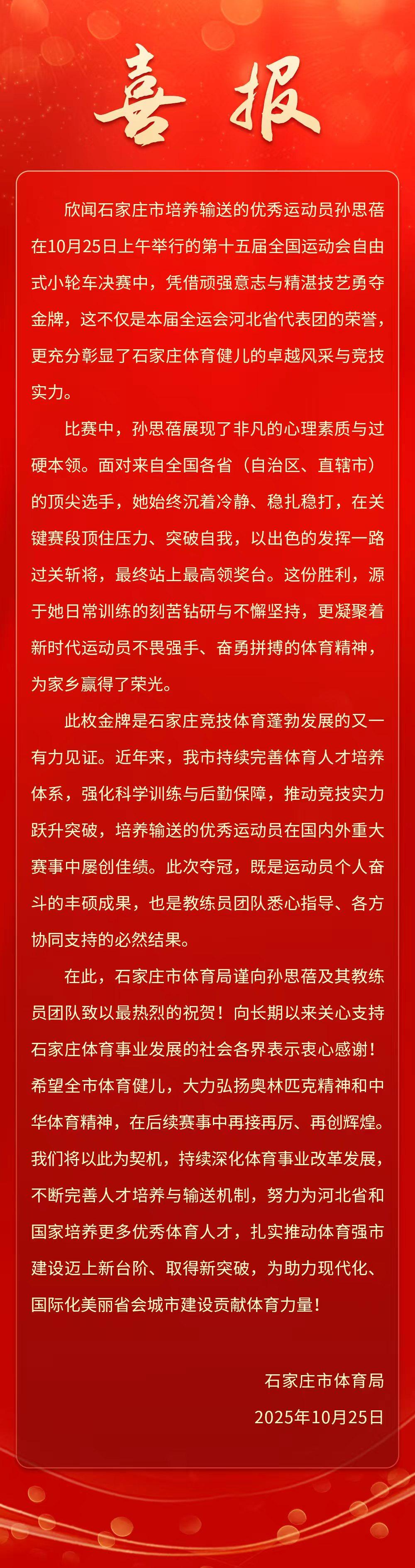 10月25日上午,第十五届全国运动会自由式小轮车女子公园赛在深圳结束,石家庄运动员孙思蓓凭借出色的腾空高度和高难度的动作组合,以94.30分的成绩夺得金牌,为河北体育代表团在本届全运会再添一金。这也是石家庄运动员在本届全运会上获得的首枚金牌。