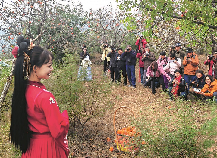 “柿”情画意:满园秋色引客来,汉服舞动醉金秋。井陉的柿子,不仅甜在嘴里,更美在景中。10月25日,在乔家庄村,村民张子书刚从自家的柿园里背出一筐沉甸甸、红艳艳的果实,立刻就被一群早已等候在此的摄影家们“包围”,快门声此起彼伏。张子书的柿园拥有近百棵柿子树,每年当柿子由青转红,压弯枝头,这里便成为一道亮丽的风景线,吸引着石家庄乃至周边地区一批批摄影爱好者前来采风,捕捉这限定版的秋日韵味。“今年,我们摄影俱乐部特意带着穿着汉服的模特一起来拍摄。”摄影俱乐部的组织者介绍道。想象一下那番景象:虬曲苍劲的柿树下,身着华美汉服的模特翩跹起舞,衣袂飘飘,与身后如火如荼的柿子相映成趣。传统服饰与田园丰收景致巧妙融合,构成一幅幅绝美的画面,在摄影师的镜头下被瞬间定格,美不胜收。这不仅为摄影创作提供了丰富素材,也为古老的柿园注入了新的文化活力,让农业景观焕发出别样的魅力。