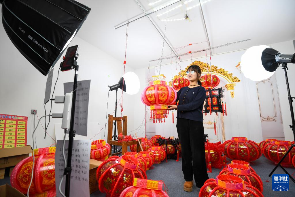 12月10日,在河北省石家庄市藁城区屯头村一家宫灯销售处,直播人员进行线上销售。近日,河北省石家庄市藁城区屯头村生产的藁城宫灯进入销售旺季,当地村民加紧赶制传统宫灯,供应市场。藁城宫灯是河北省级非物质文化遗产。目前,藁城宫灯已有18个系列300多个品种,产品远销全国各地。新华社发 张晓峰 摄