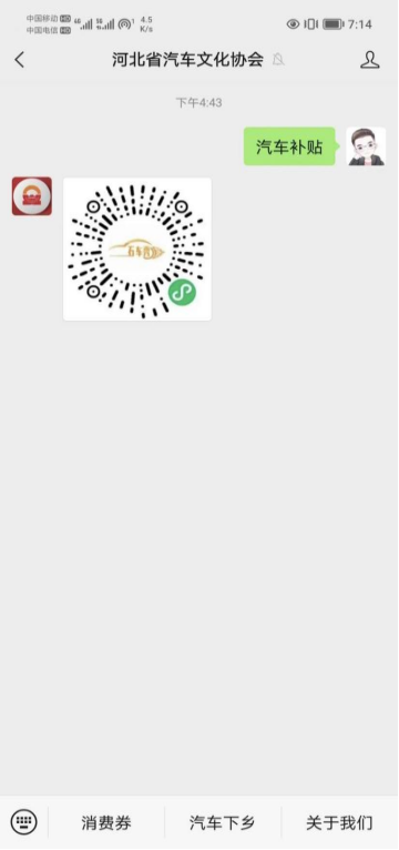 领取购车补贴通道二:打开微信,关注“河北省汽车文化协会”公众号,回复“汽车补贴”,自动弹出“石车秀车网”小程序二维码,长按识别二维码,进入石车秀车网小程序,在首页上点击“桥西区汽车促消费补贴领取入口”。