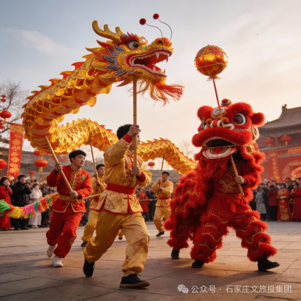 金龙腾跃,舞动新春。由舞龙团队带来多造型的花式舞龙、舞狮表演。