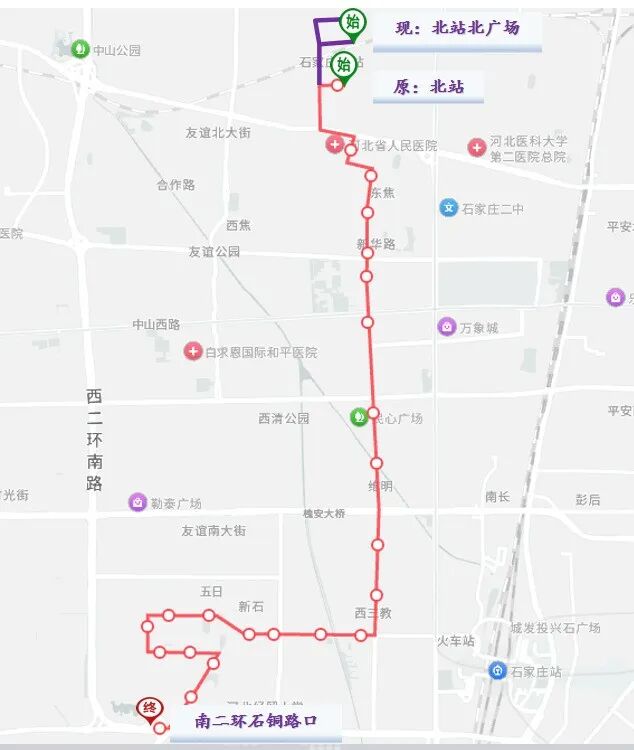1.起止点:始发站南二环石铜路口不变,终点站由北站南广场调整为北站北广场。