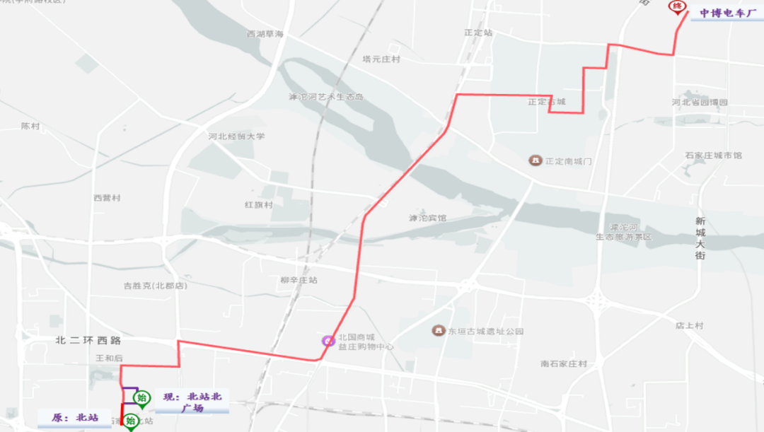3.调后路径:园博园大街、晨光路、尉陀街、正无路、城东街、恒山路、旺泉南街、中山路、镇州街、常山路、107国道、北二环、中华北大街、联盟西路、泰华街、滨华路、文苑街、北城路、泰华街返回。