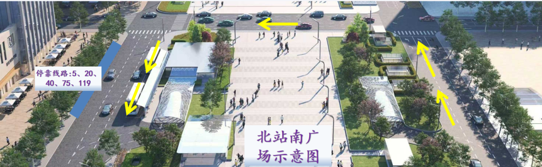 将原途经市庄路北站的公交5路、20路、40路、75路、119路迁入北站南广场运行,行经市庄路运行北站东街、市庄北路、北站西街、市庄路返回。