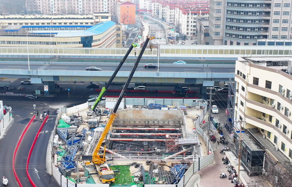 1月29日,中铁二十局集团建设者在石家庄地铁5号线一期工程和平西路站盾构接收井顶板作业现场施工。记者 赵永辉 摄