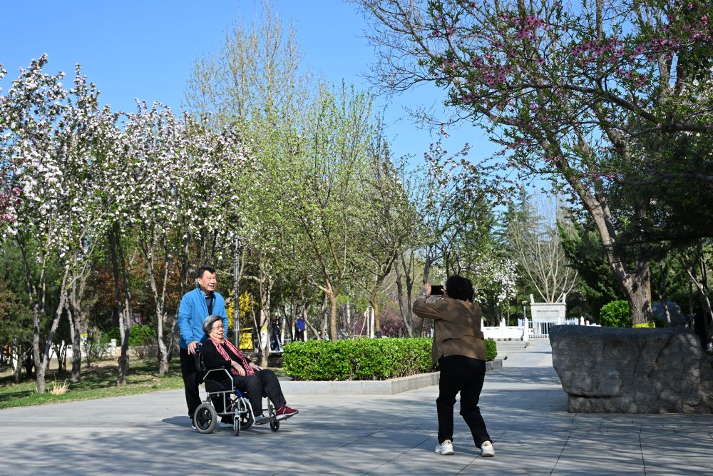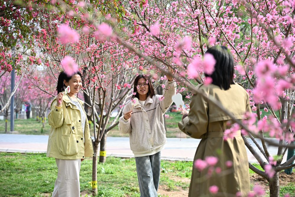 4月1日,市民在石家庄市石太公园赏花拍照。付杉 摄