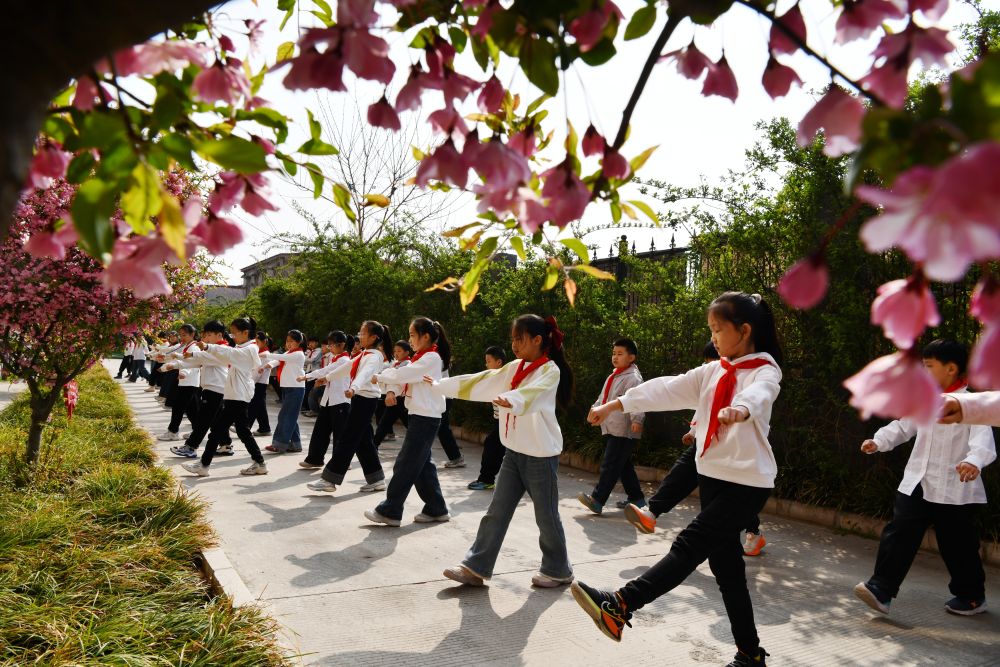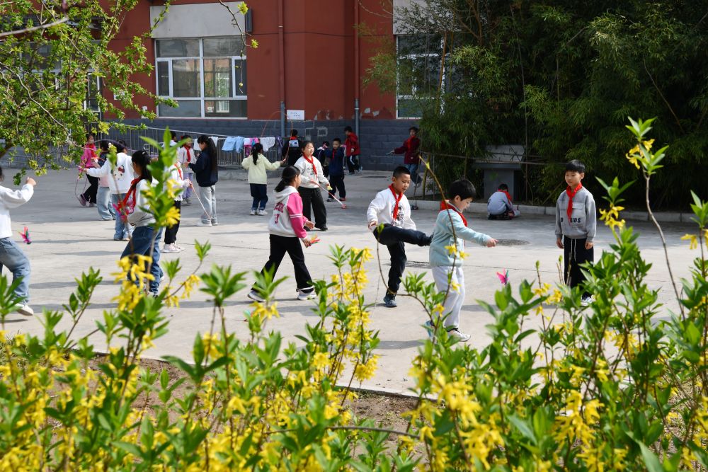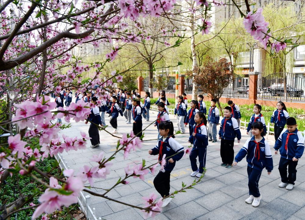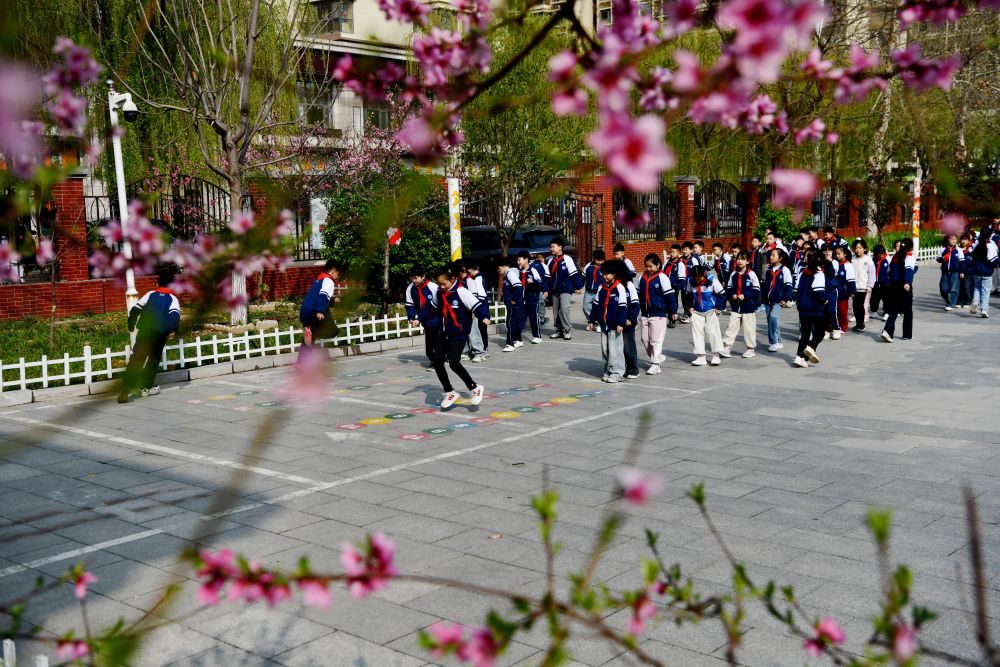 3月31日,学生在石家庄市栾城区兴安大街小学开满鲜花的校园里开展校园运动。李明发 摄