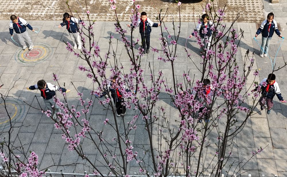 3月31日,学生在石家庄市栾城区兴安大街小学开满鲜花的校园里开展校园运动(无人机照片)。李明发 摄