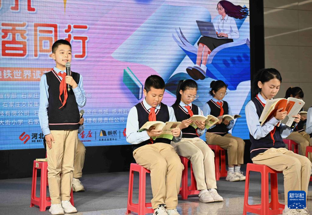 4月19日,小朋友在河北省石家庄市图书馆全民阅读主题活动现场诵读红色故事。在首个“全民阅读活动周”和第31个世界读书日即将到来之际,人们参加各种各样的阅读活动。新华社发 陈其保 摄