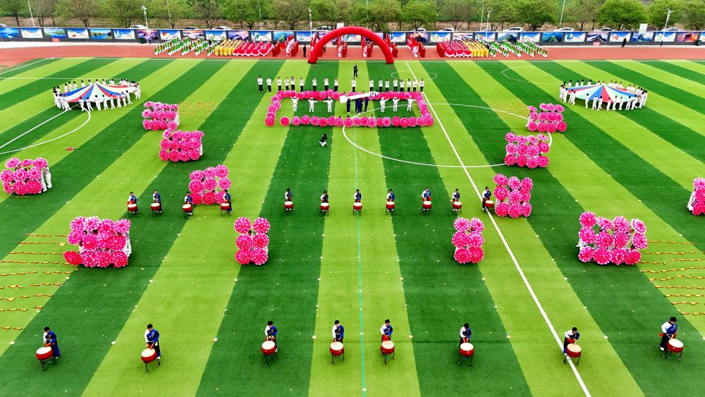 4月16日,在石家庄市栾城区春季中小学生田径运动会上,太阳城小学学生在进行《盛世欢歌》展演(无人机照片)。李明发 摄
