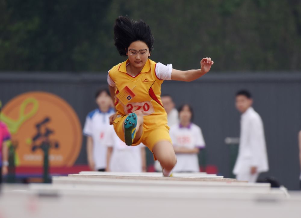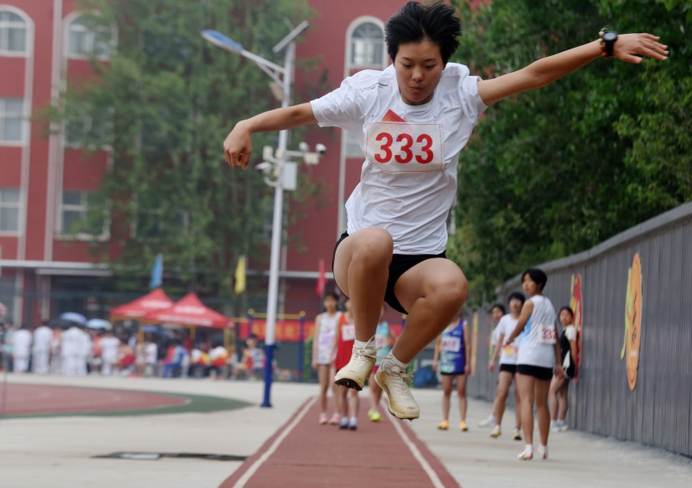 4月16日,在石家庄市栾城区春季中小学生田径运动会上,学生在进行三级跳远比赛。