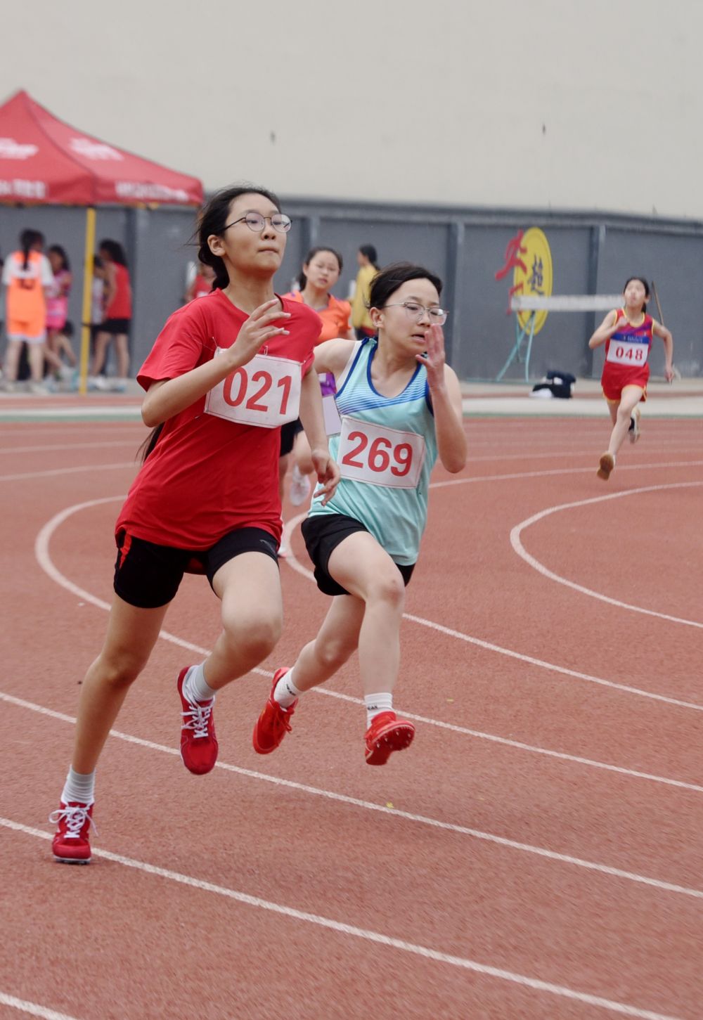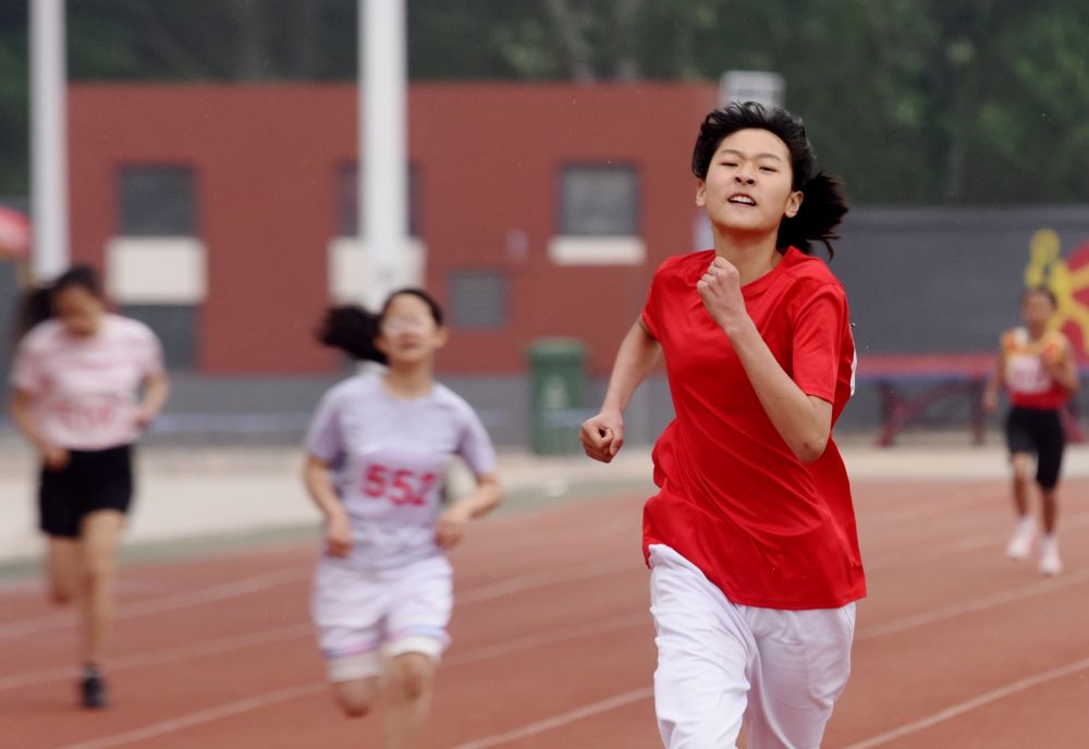 4月16日,在石家庄市栾城区春季中小学生田径运动会上,学生在进行400米田径比赛。李明发 摄