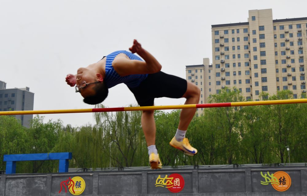 4月16日,在石家庄市栾城区春季中小学生田径运动会上,学生在进行跳高比赛。李明发 摄
