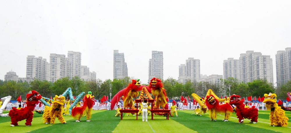 4月16日,在石家庄市栾城区春季中小学生田径运动会上,栾城中学学生在进行《龙腾狮舞忆初心 红旗漫卷向未来》展演。李明发 摄