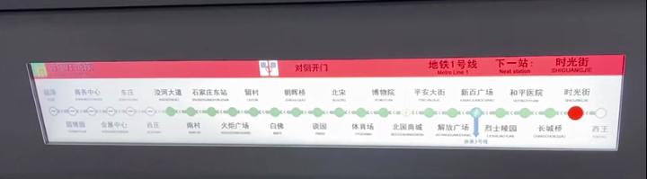 2、车门上方的动态地图,有运行路线,动态地图会显示终点站。小交路的动态地图显示西庄站-福泽站图标关闭,运行的大交路动态地图显示所有车站图标打开。列车在驶出站台时,车厢内的广播会及时进行终点站播报。