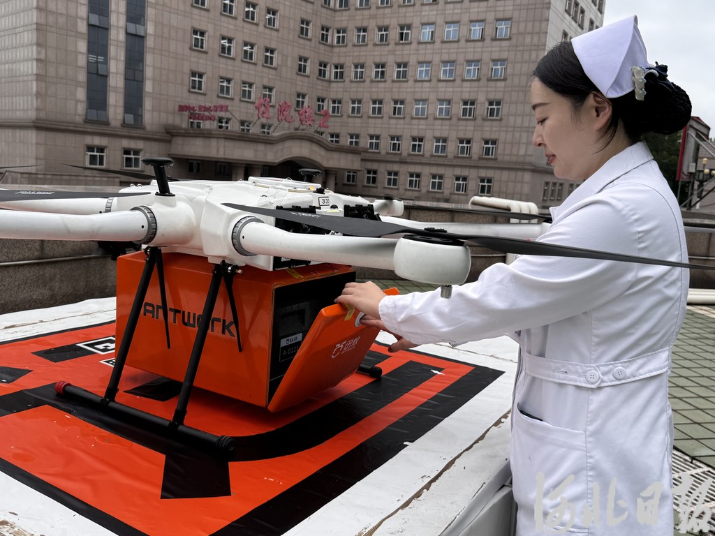 “来了来了。”7月3日8时51分,位于石家庄市和平路的河北医科大学第二医院二楼天台上,门诊部护士胡慧欣看到院区南侧上空飞来的无人机,再次检查自己手中待运输的样本。