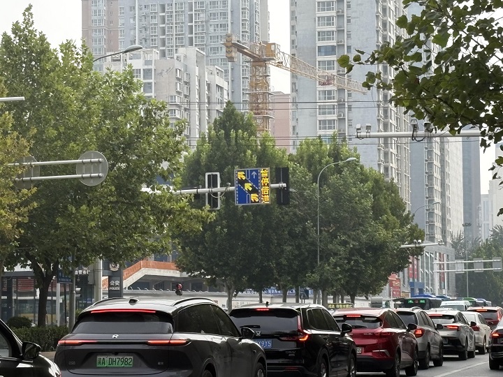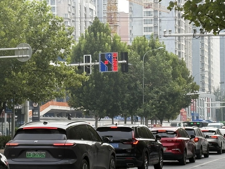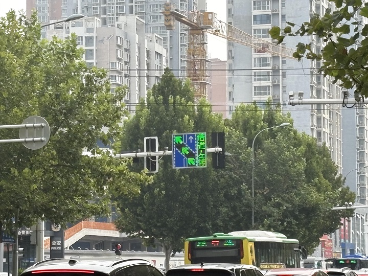 9月11日9时30分,中山路与翟营大街交口车辆川流不息,驾驶人按照交通信号灯指示有序通行。记者在现场看到,车辆进入该路口前,前方有明显的提示牌提示有借道左转车道。提示牌上写有黄底黑字的“交警提示 借道左转”,下方写有蓝底白字的“绿屏进入,红屏等待”文字信息。同时,对向信号灯后方增设“借道左转电子提示屏”。