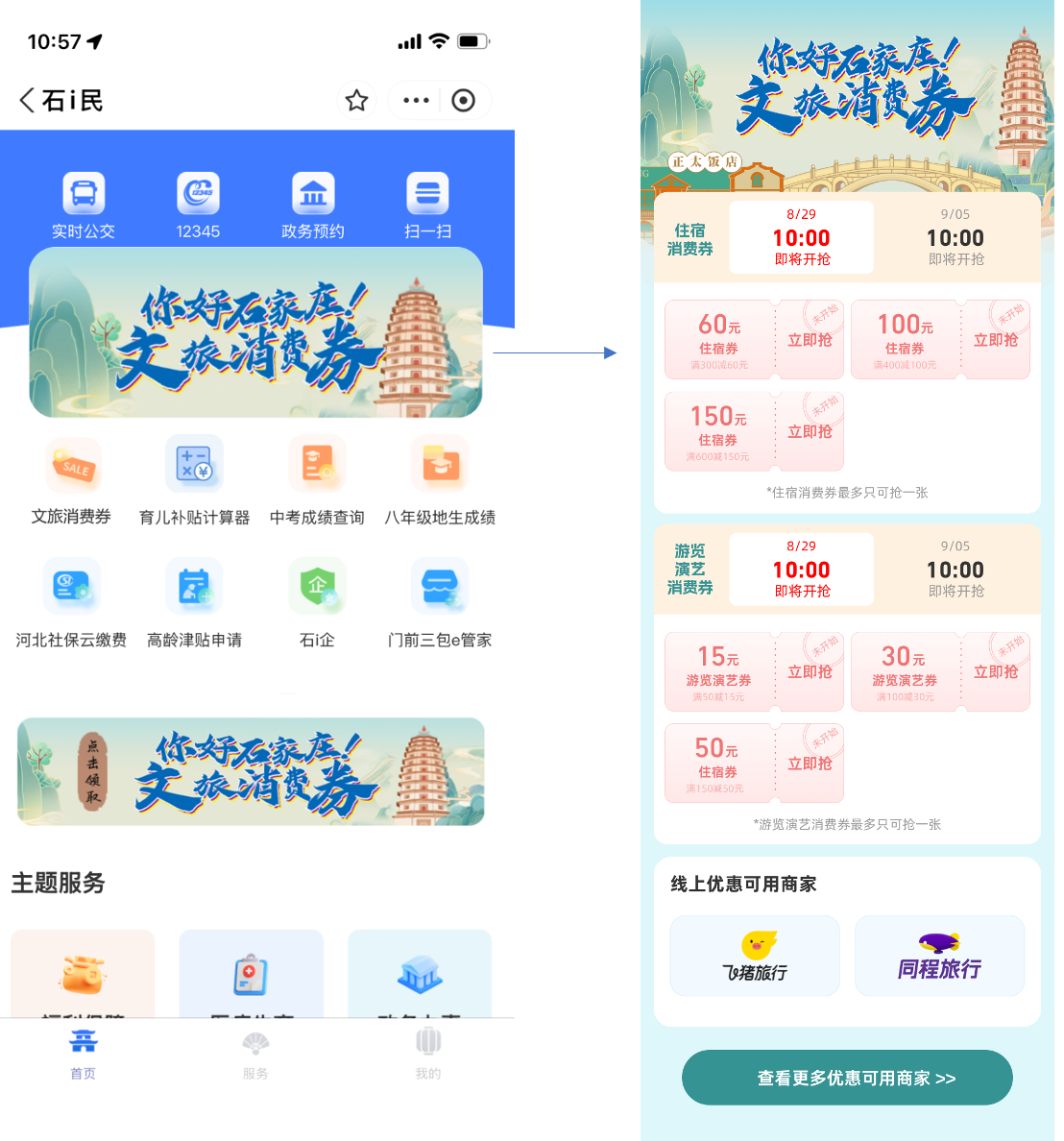 石家庄市文旅消费券自8月29日在支付宝平台“石i民”小程序正式上线开抢,将持续至2025年10月30日,每周五10:00开放领券,先到先得,领完即止。目前,活动参与商户已突破200家,飞猪旅行、同程旅行、去哪儿旅行均支持线上使用优惠券(“住宿类”消费券),最高可立减150元,使用更便捷。