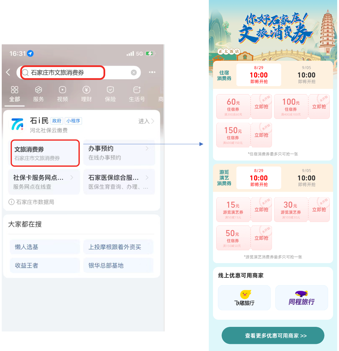 消费者登录“支付宝”APP首页搜索“石家庄市文旅消费券”,通过“石i民”小程序推荐位“文旅消费券”进入对应活动入口抢券。