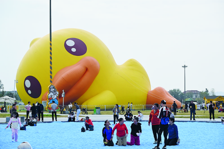 滹沱河艺术生态岛以多个主题区域为依托,构建起了全龄欢乐矩阵,推出一系列主题休闲娱乐活动,让游客流连忘返。在滹沱河艺术生态岛淘气营亲子乐园和大黄鸭主题区里,孩子们欢笑声不断,巨型滑梯、神秘城堡吸引着他们玩耍、探索。不仅小朋友喜欢,大黄鸭萌态的造型让大人也感到十分治愈。从山西太原来旅游的姚曦指着正在沙池里堆城堡的儿子说,“孩子一进来就玩疯了,不想走。我们在这里看着美景也非常放松,这次来石家庄,玩得开心又舒心。”