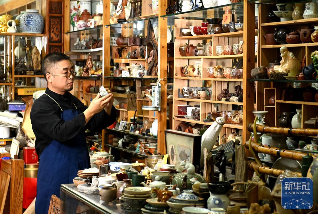 10月11日,在位于河北省石家庄市桥西区的工作室内,李军航在检查残破瓷器情况。新华社发 陈其保 摄