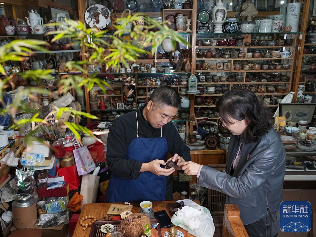 10月11日,在位于河北省石家庄市桥西区的工作室内,李军航在接待顾客。新华社发 闫志国 摄