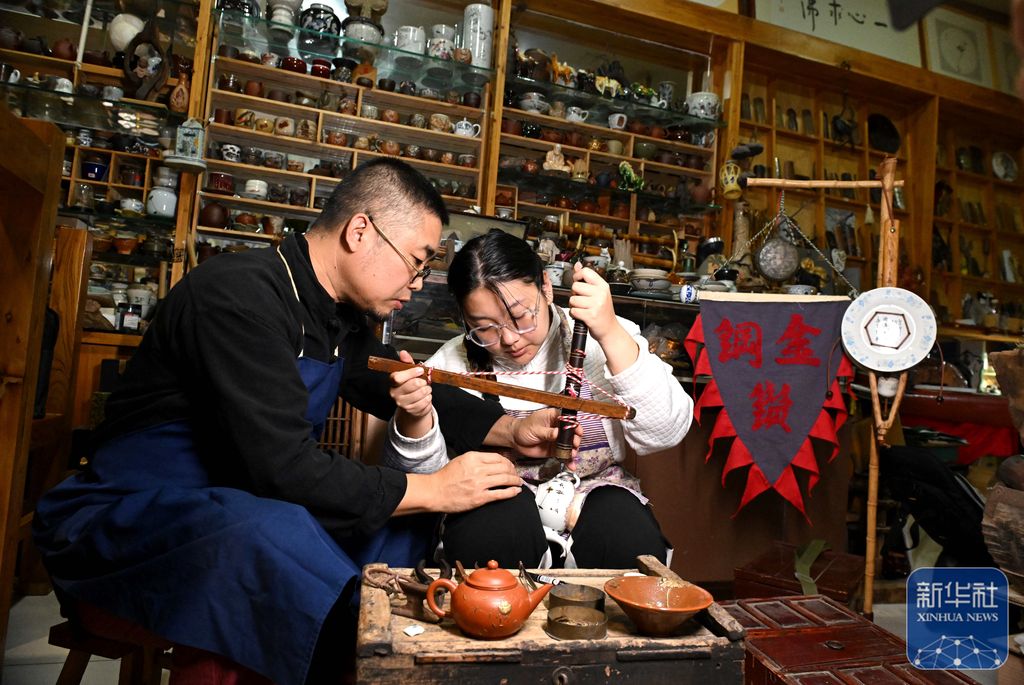 10月11日,在位于河北省石家庄市桥西区的工作室内,李军航(左)指导女儿李雨童使用金刚钻为残破瓷器打孔。新华社发 陈其保 摄