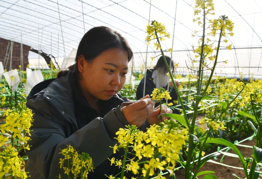 11月22日,在石家庄市栾城区河北京蔬农业科技有限公司优质蔬菜培育基地,农技人员在为菜心花授粉。李明发 摄