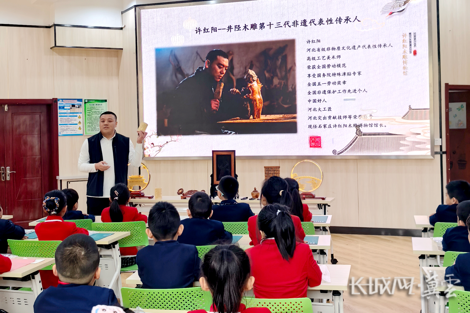 许红阳为学生介绍井陉木雕技艺。许红阳供图