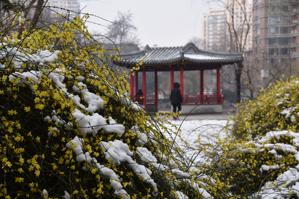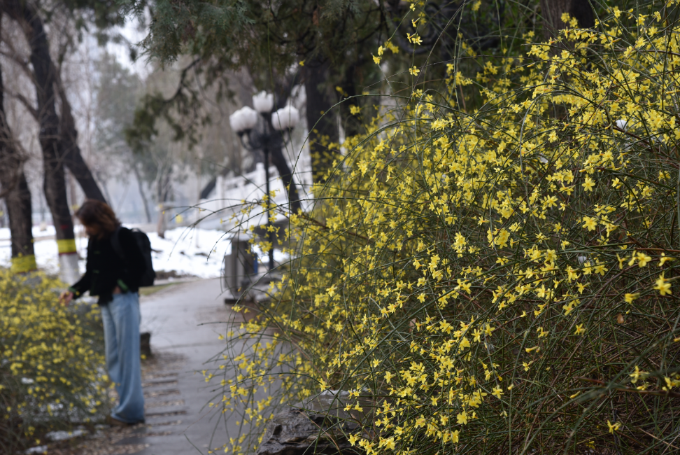 3月3日,在石家庄人民广场和长安公园,迎春花在春雪的映衬下绽放。枝条上的娇嫩花朵顶着薄雪,形成“雪中黄花”的独特景观,成为早春限定浪漫。崔立卿 摄