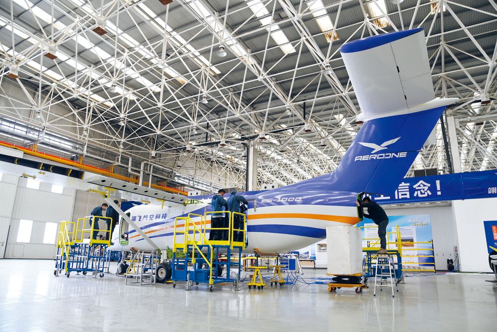 在位于石家庄装备制造产业园的翊飞航空科技(石家庄)有限公司,工作人员在进行大型无人运输机的组装。记者 张 震 摄