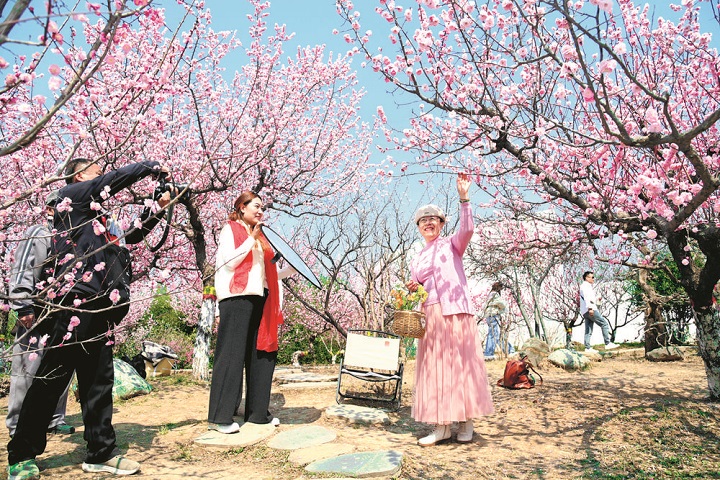 园内的缤纷春色远不止于此。撷红桥和环园主路附近的千余株榆叶梅热烈绽放,红粉相间的花朵簇拥枝头,似一团团燃烧的春日焰火,热烈而鲜活。竹园西侧的数百株美人梅也不甘示弱,粉紫花瓣呈蝶形舒展,簇拥绽放的花枝宛如群蝶翩跹,娇俏灵动、美不胜收。榆叶梅的热烈与美人梅的婉约相映成辉,呈现出斑斓多姿的色彩。