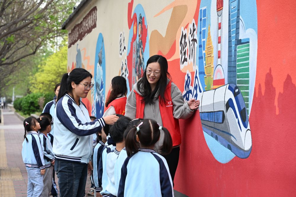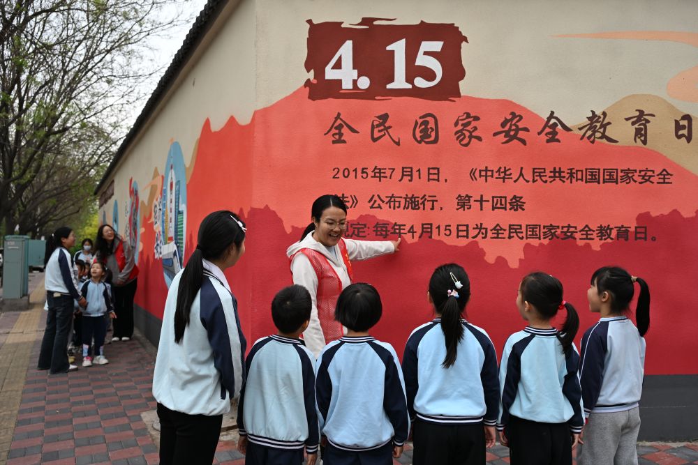 4月13日,在石家庄市新华区国家安全教育主题街,辖区志愿者向小朋友讲解国家安全知识。付杉 摄