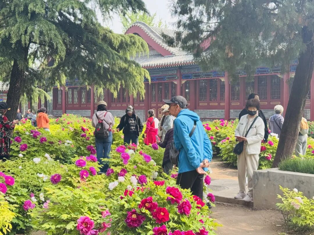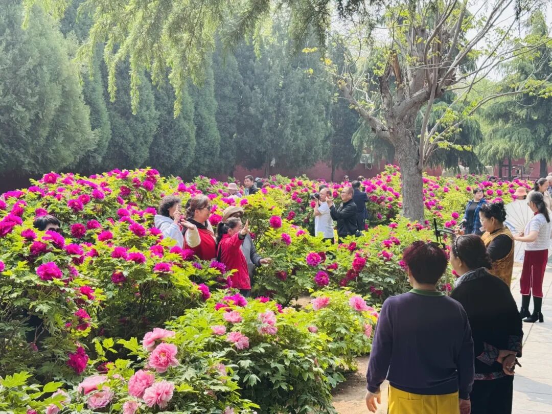 园内赏景人群络绎不绝,热闹而有序,处处洋溢着春日的生机与暖意。摄影爱好者们穿梭在花丛中寻找最佳角度。还有市民特意架起画板,以花为媒、以古为景,用笔墨勾勒出牡丹的娇艳。大家携朋带友,在牡丹花丛中漫步徜徉、拍照打卡,欢声笑语萦绕园间,尽情享受着春日里的美好时光,感受着古寺与牡丹交织的独特韵味。